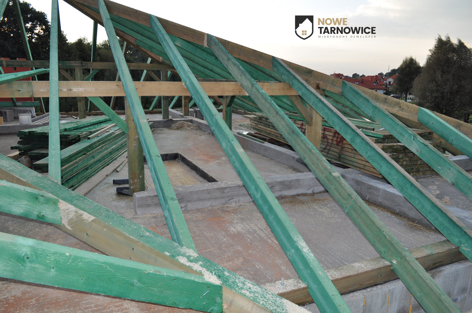Od ostatniego wpisu upłynął już prawie miesiąc, lecz na budowie praca wre. W sierpniu zalaliśmy strop żelbetowy (monolityczny) nad piętrem, w którym zastosowaliśmy podciągi oraz specjalistyczne nadciągi przenoszące równomiernie ciężar dachu na ściany nośne. W międzyczasie rozpoczęliśmy prace nad ściankami działowymi w apartamentach na piętrze, wykonaliśmy ściany szczytowe oraz kominy systemowe oraz wykonaliśmy więźbę dachową.